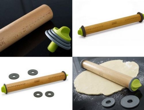 При раскатке теста измерительные все делается на глаз: размеры, толщина, диаметр… Но замеры нужны не только педантичным любителям точных наук. Часто от толщины теста зависит время выпекания, количество начинки и даже название изделия! Дизайнер Дэмьен Эвансизобрел скалку-линейку, которая напоминает штангу с круглыми блинами. Эти шайбы. Которые нанизываются по краям скалки регулируют толщину коржа по всему периметру раскатываемой поверхности.