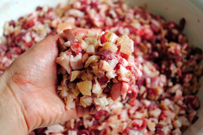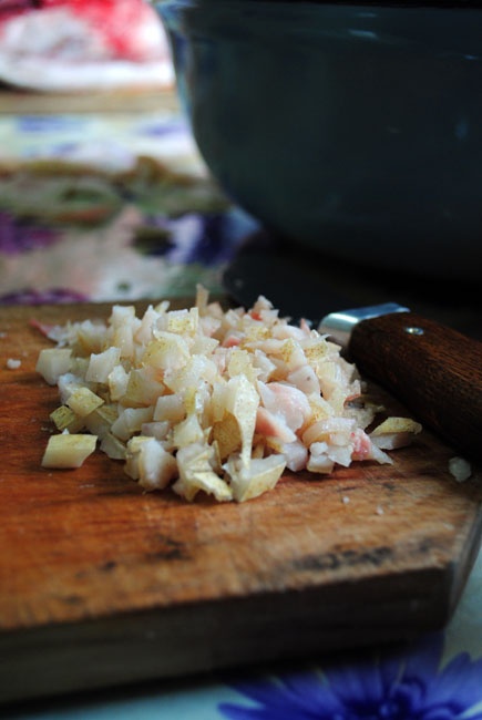 Итак, для начала нам понадобятся все шкурки с головы, а также уши и ушные раковины (естественно хорошо вымытые и обработанные!.. Их нарезаем на мелкие квадратики. Приблизительно вот так: