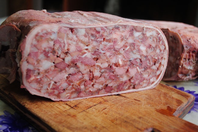 После того как сальтисон сварился, достаем его и помещаем под пресс (у нас была железная плита, килограмм 10). Оставляем на ночь в прохладном месте.