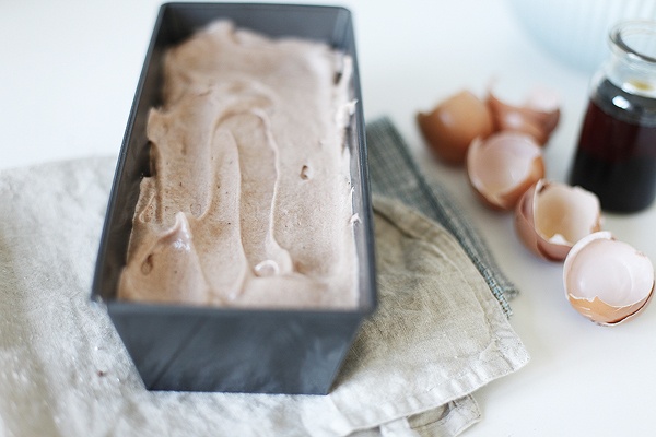 Переложите в ничем не смазанную форму. Постучите формой об стол, чтобы вышли крупные пузырьки воздуха.