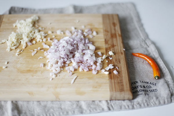 Для начинки порежьте мелко чеснок и лук.