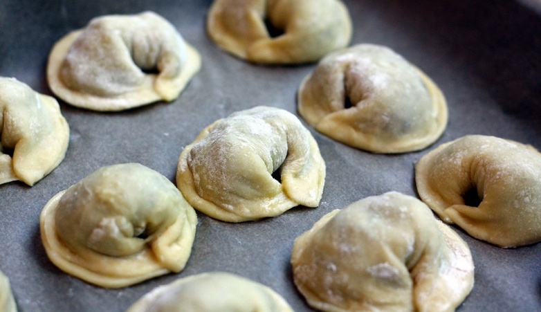 Все виды мяса проворачиваются через мясорубку, а зелень и лук мелко режутся и смешиваются с фаршем. Нужно замешать крутое тесто и оставить на 15–20 минут под полотенцем, после чего из него раскатывается в тонкий пласт толщиной до 1 мм (чем тоньше, тем лучше). Из листа вырежьте при помощи стакана круги, их края смочите водой (чтобы они потом прочнее соединились). На середину кружка положите чайную ложку начинки и тщательно защипите, чтобы получился полумесяц, а затем соедините его углы. Аккуратно выложите готовые изделия на доске и оставьте их чуть подсохнуть, после чего их можно убрать в морозилку.