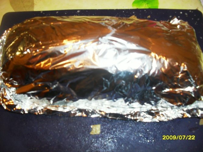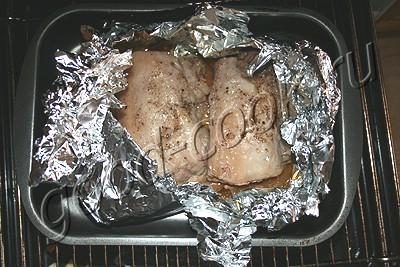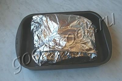 Отдохнувшее мясо заворачиваем в фольгу. Здесь важно сделать это как можно более герметично, чтобы мясной сок не просочился наружу, а остался с мясом, поэтому не жалейте фольги. Мясо в фольге помещаем на противень и в разогретую духовку.