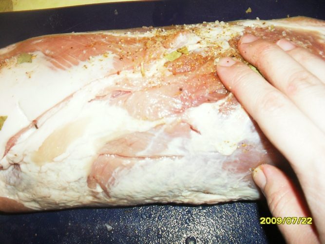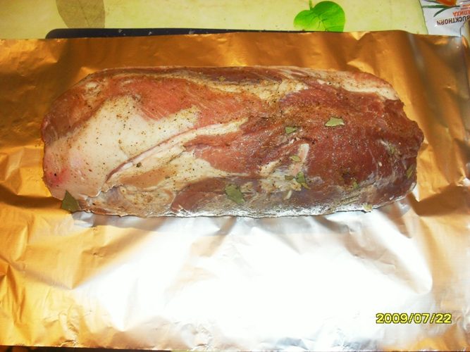 Если мясо окружает толстый слой сала, то его лучше срезать, оставив только 0,5см. Так как мясо запекается в закрытом пространстве, то сало не поджаривается, а варится на пару, и не всем понравится вкус такого варёного сала. Но если сало нравится в любом виде, то его можно не срезать.