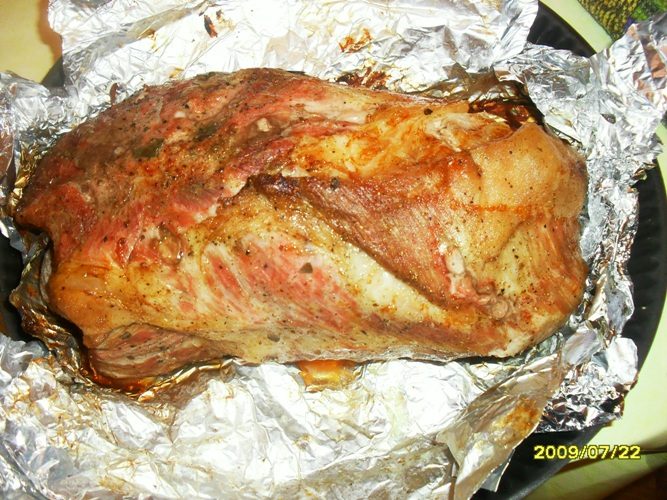Когда ваше мясо проведет в предварительно разогретой духовке (сначала разогреваем на максимуме, потом убавляем до среднего) 2,5-3,5 часа (в зависимости от размера куска), можно открыть фольгу и посмотреть, что получилось, приблизительно это должно выглядеть так…