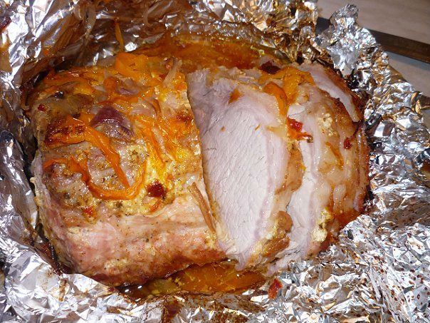 Оно хорошо пропекается, оставаясь достаточно сочным, не пригорает и пропитывается ароматами сопутствующих продуктов. Мне очень понравилось добавлять к мясу апельсины, мандарины, грейпфрут (шкурку, но не мякоть), ананас, груши и конечно же яблоки. Очень неплохо сочетаются с мясом сливы, вишни и клюква. Только от температуры они становятся пюреобразными и плохо защищают от подгорания. А вот капуста и сырой лук дали не очень приятный специфический привкус.