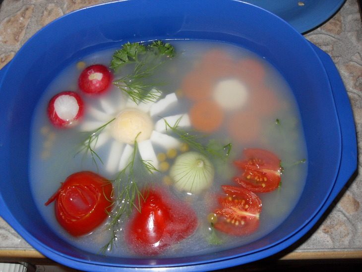 и заливаем бульоном (который тоже можно поперчить и еще подсолить по вкусу). Убираем блюдо в холодильник до застывания.