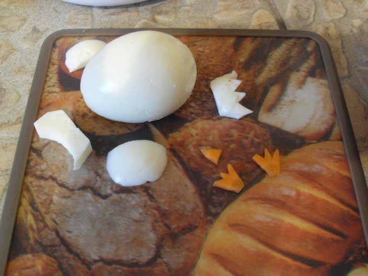 яйца чистим. С одного яйца срезаем снизу шайбу для устойчивости, из нее делаем хвост. Из другого яйца вырезаем шею и крылья. Шайбу морковки вырезаем под лапки и клюв.