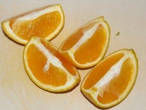Цыплёнка хорошо разморозить. У меня на это ушли целые сутки. Часть апельсинов режем кольцами.