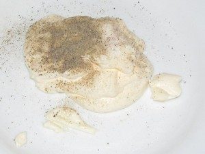 Для смазывания курицы снаружи берём на выбор майонез, сметану, йогурт без фруктов, растительное масло и т.п. по вашему выбору. В общем, любимый вариант. Добавляем туда соль, перец. Перемешиваем. Обильно смазываем курицу со всех сторон и выкладываем на противень.