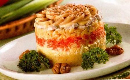 Слоеные салаты пользуются большой популярностью, их готовят и в будни, и для праздничного стола. Для их приготовления используют самые разные продукты; мясо и рыба очень удачно сочетаются в таких салатах с овощами, грибами и т. д., и чем больше фантазии проявляет хозяйка, тем более оригинальные и изысканные блюда у нее получаются.