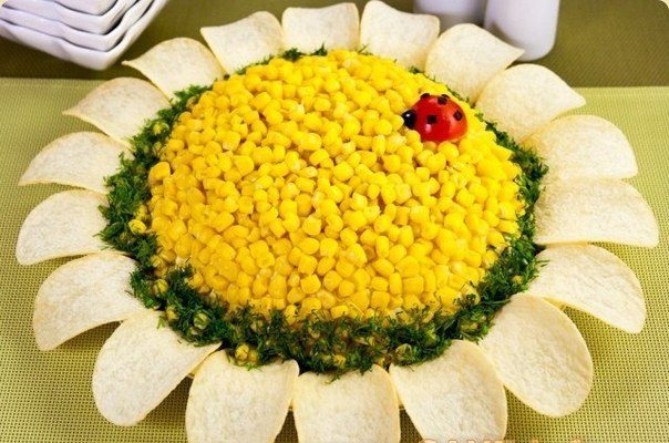 Выложить кукурузу. По кругу воткнуть чипсы.
