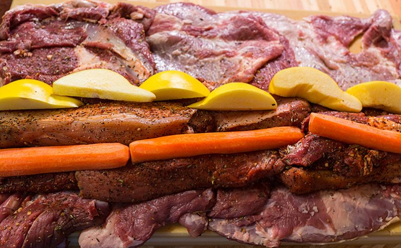 Укладываем подмаринованные куски телятины и баранины в оболочку.