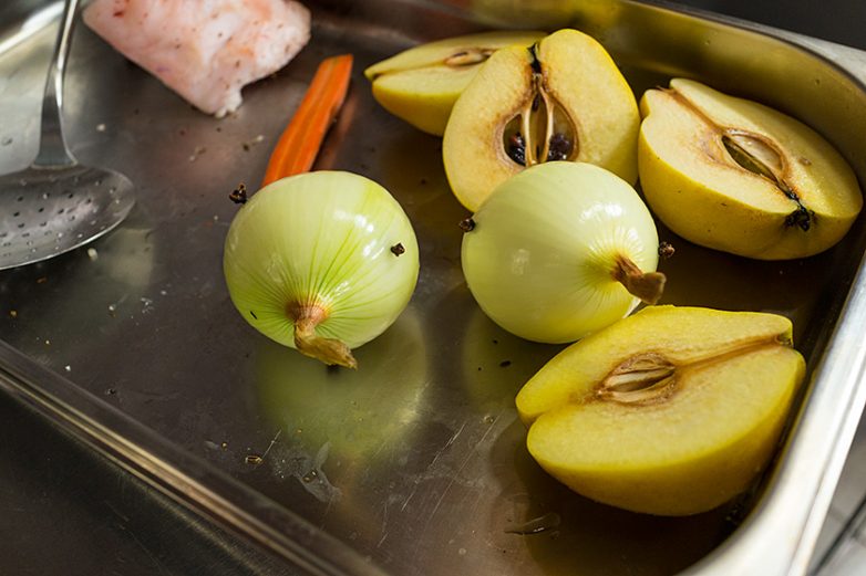 Гвоздику в лук для аромата, айва крупными кусками. Лук и айва тоже помогут держать рулет на поверхности казана.