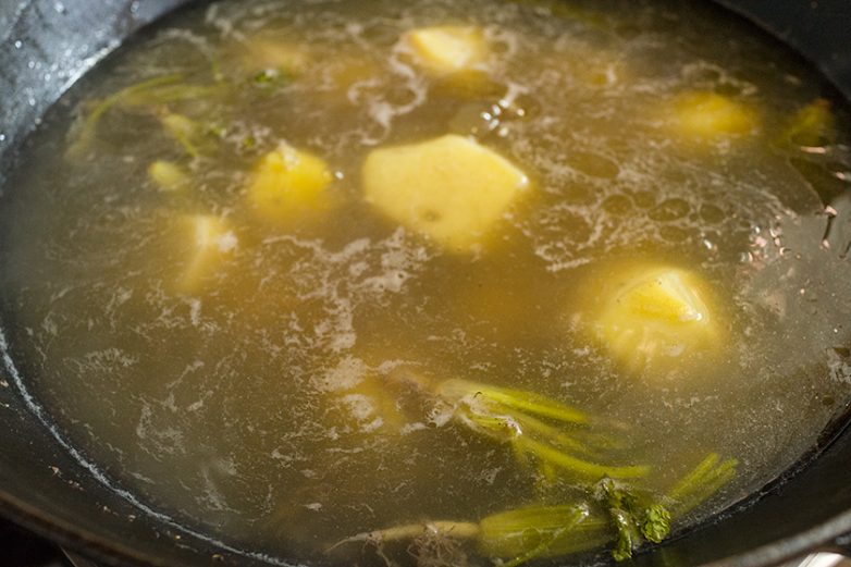В казан добавил корешки кинзы, прибавил огонь. Вода, ставшая более густой от выделившегося в нее желатина, закипела. Опустил картофель и отварил.