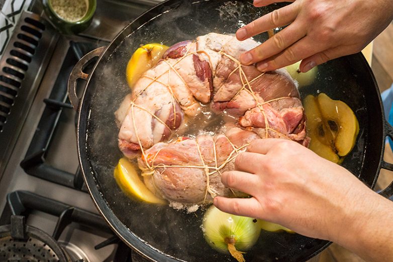 После того, как требуемая температура была достигнута, я вынес рулет на холод и подвесил его, чтобы он остыл и его поверхность подсохла. Голяшки и айву, что варилась вместе с рулетом, я тоже убрал из казана.