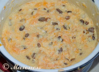 3. В миске перемешать рис, тыквенную стружку, промытый изюм, сахар, сметану, соль. Затем тщательно взбить яйца миксером до воздушной пены и аккуратно подмешать в начинку.