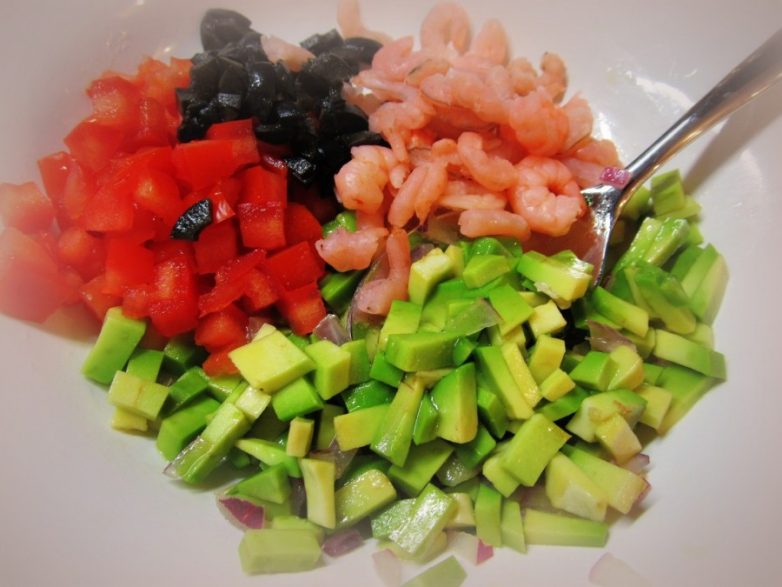 Помидор так же нарезать кубиком, маслины мелко нарубить, добавить креветки, перемешать.