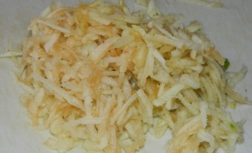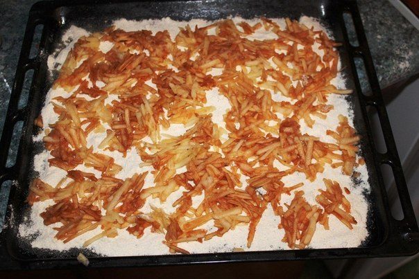 Сверху обсыпаем тертым сливочным маслом. Теперь противень отправляем в духовку на 20-25 минут.