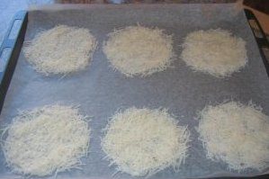 Можно приготовить заготовки в микроволновке. Тарелку смажьтемаслом и как на сковороду насыпьте сыр. Поставьте в микроволновку на примерно на 1 мин при высокой мощности.