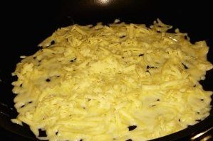 Равномерно насыпать на сковороду (диаметром около 16 см) сыр в виде блинчика.