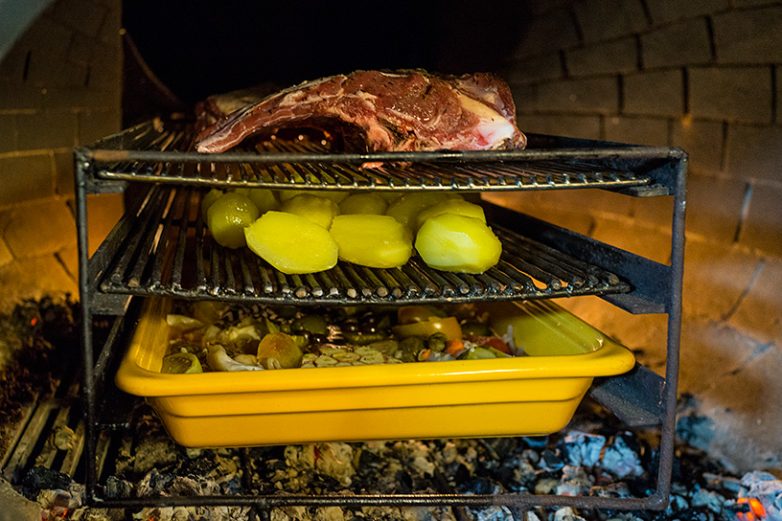 А уж на самый верх мясо. Пусть соки с него капают сначала на картофель, а потом, набравшись дымком от печи, в супчик.