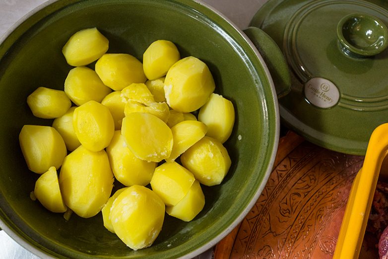 Если будете ставить картофель в печь без меня, подварите его, пожалуйста. Не до готовности, а так, чтобы он только стал мягче на поверхности и просолился. Как сварится в половину готовности, сливайте воду, положите кусок топленого масла и пусть еще чуть-чуть постоит.