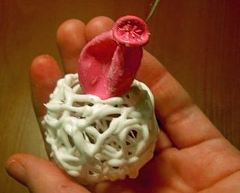 Осторожно за нитку извлекаем из изделия оболочку лопнувшего воздушного шарика.