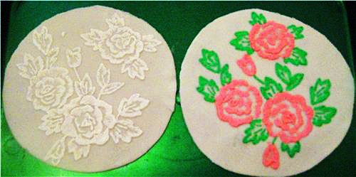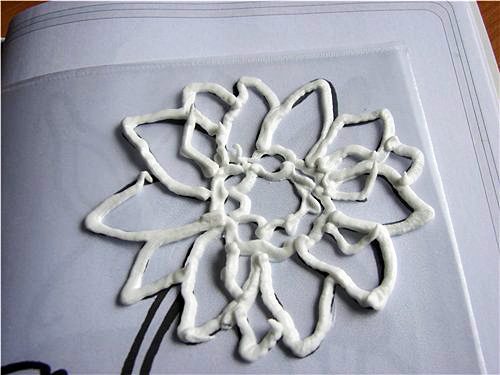4) Выдавливают айсинг на полиэтиленовую пленку по подложенному под нее узору. При наличии достаточных художественных навыков можно обойтись и без шаблонов, свободно рисуя массой по своей фантазии.