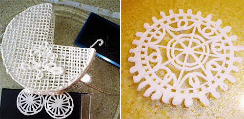 Для изготовления крупных объемных айсинг-украшений для них по чертежам изготавливают отдельные детали, которые после полного высыхания склеивают в единое изделие (например, в эйфелеву башню – см. ниже).