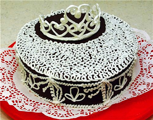 Корона высушена на пленке, уложенной на лежащую на боку цилиндрическую банку. Украшающие сахарные бусинки помещены на айсинг сразу после его отсадки. После сушки короны незадолго до подачи ее на стол на нее можно отсадить «бриллианты» из капелек густо сваренного прозрачного бесцветного желе.