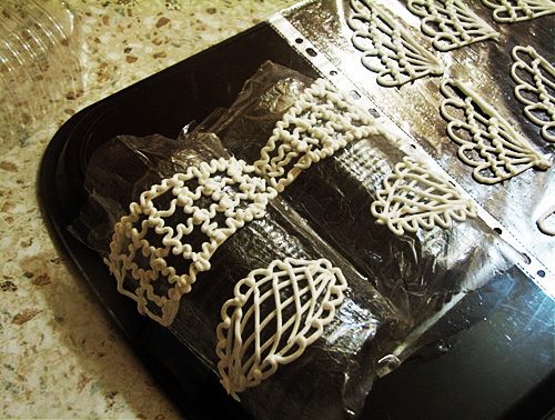 При желании получить объемное украшение, пленку с отсаженным узором помещают для сушки на какую-либо искривленную поверхность – например, на боковую поверхность цилиндрической кастрюли, в разворот раскрытой книги и т.п.