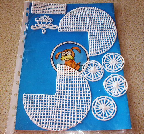 2 боковины коляски (секторы в 3/4 круга) — отсаживаем контур, а внутри него — прямоугольную сеточку;1 полоска, длиной в 3/4 окружности (как длина периметра боковины) и шириной в ширину будущей коляски — деталь корпуса коляски, соединяющая две боковины; после отсадки эта деталь должна быть изогнута по радиусу, равному радиусу боковины, и высушена в этом положении; т.е. сушим на шаблоне, сложенном из CD;4 колеса (рисунок внутри колес любой по замыслу домашнего художника);1 прямоугольничек, примерно, 4х6 см (он крепится под дно коляски, а нему будут крепиться колеса);2 красивые декоративные завитушки на бока коляски;2 ручки к колясочке; можно сделать и «тюлевую» занавесочку;1 кружевной кружок диаметром около 8 см в качестве основания всего сооружения — на него будем устанавливать нашу коляску.