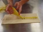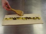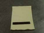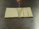 Каждую пластину слоеного теста раскатаем в прямоугольники длиной около 27—30 см. Нарежем их на длинные полоски шириной около 2,5 см.
