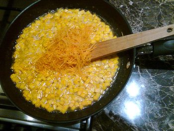 На небольшом огне обжариваем в получившейся карамели тыкву и морковь.