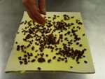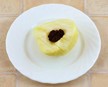 На каждый квадрат уложим по диагонали половинку груши с изюмом.