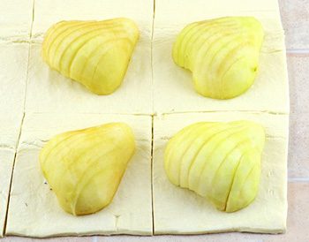 На середину тестяных кругов сначала кладем творог (можно подслащенный с изюмом), а сверху — подготовленные груши.