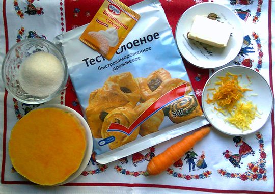 • готовое бездрожжевое слоёное тесто — 500 г (тесто размораживаем, пока занимаемся овощами)