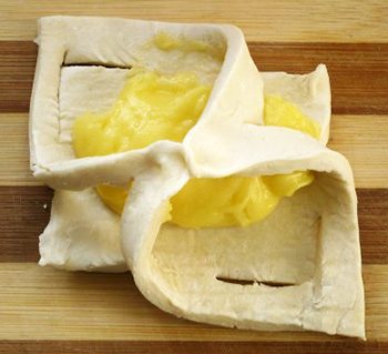 Готовое слоеное листовое тесто развернем и, не раскатывая, разрежем на квадраты или прямоугольники.