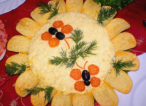 Украшение чипсами, зернами кукурузы, оливками и зеленью.