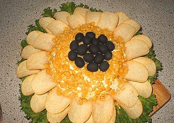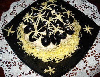 «СНЕЖИНКИ» — оформление салата или закусочного торта сыром и черными оливками.