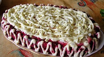 Оформление «Капли дождя» — слой сметаны или майонеза, отварная свекла, нарезанный кусочками зеленый лук.