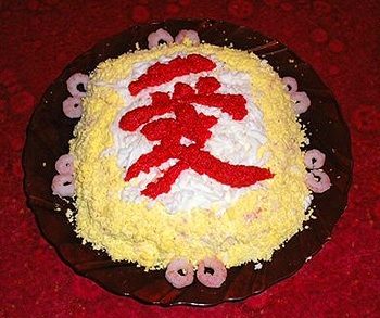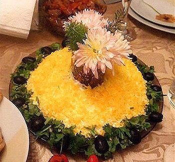 Фон — тертые желтки, посыпанные на тонкий слой майонеза, сметаны, соуса и т.п.; элементы украшения — тонкие ломтики яичного белка, кусочки кожицы чернослива, зеленый лук, листики петрушки, зерна граната.