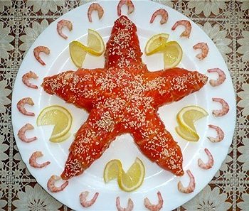 Украшение порционного салата «МОРСКОЕ ЦАРСТВО» — украшение отварной фасолью и морской капустой салата или паштета. Фигурки рыб и прочих морских жителей вырезают из разноцветных овощей.