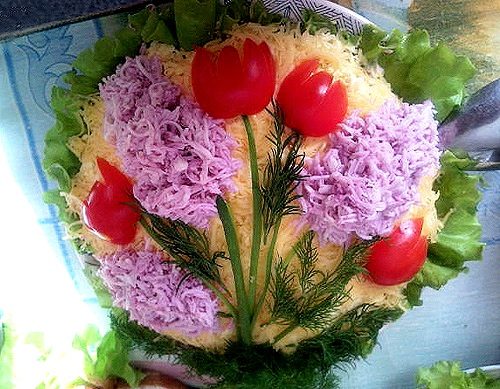 «Сирень» из натертого на крупной терке яичного белка, затем окрашенного соком свеклы. «Тюльпаны» из помидоров. Веточки зелени.