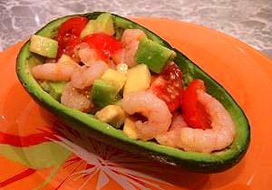 Смешать мякоть авокадо, креветки, помидоры. Немного посолить и заправить растительным маслом.
