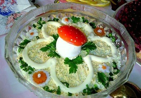 Шляпка «грибка» покрыта сырой или отварной тертой морковью, ножка — тертыми белками или редькой, или отварным рисом, или смесью сметаны и майонеза.