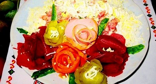 Салат с нежными «розами» из колбасы или ветчины.