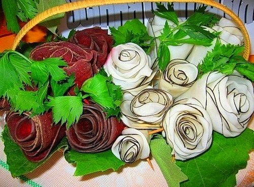 Украшение «розочками» из разных продуктов.