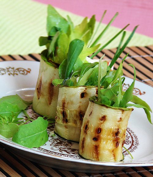 На один конец поджаренного ломтика кабачка кладем лист салата или листики рукколы, сверху кладем начинку, а на начинку еще немного рукколы.